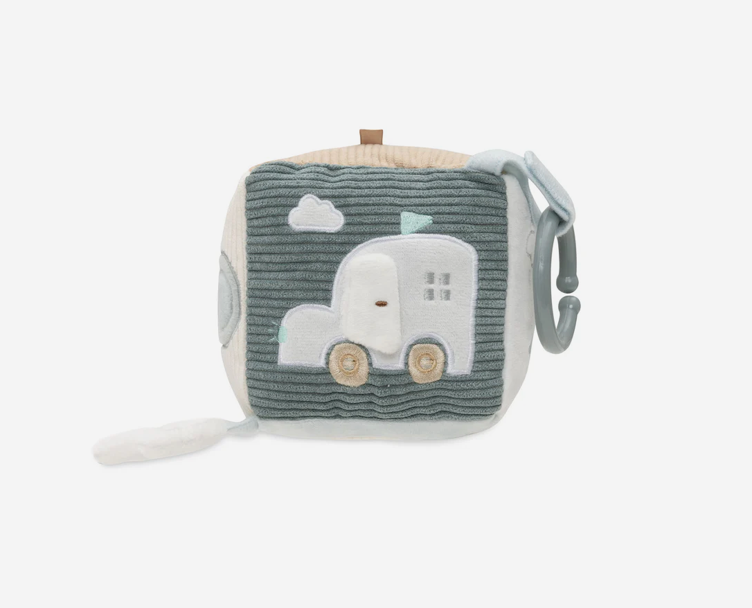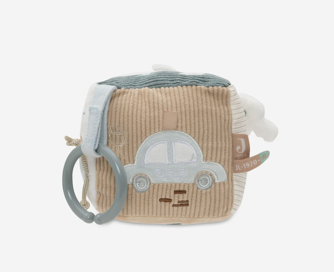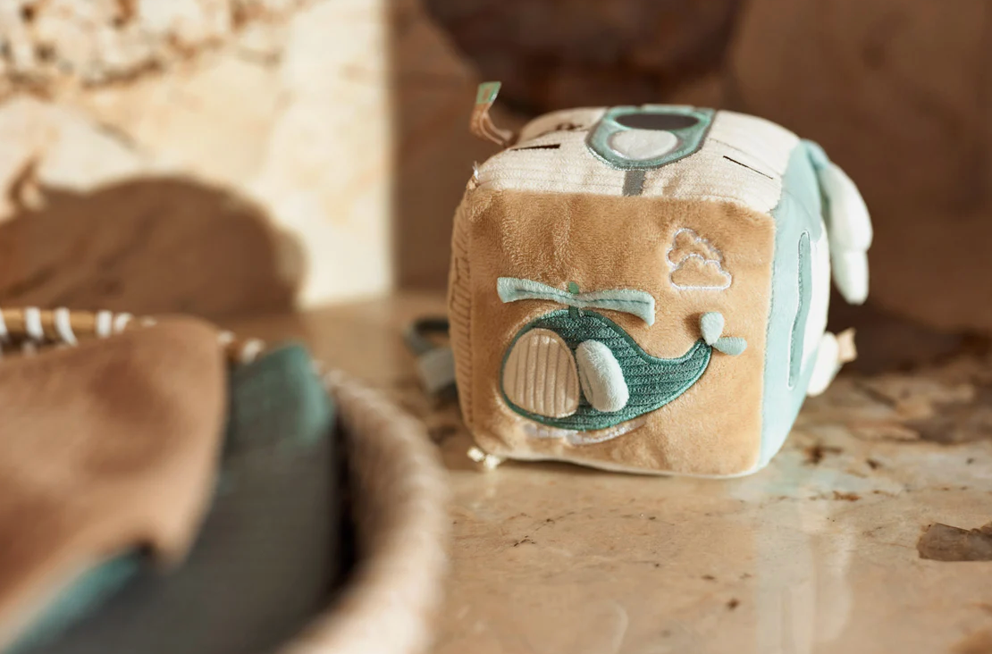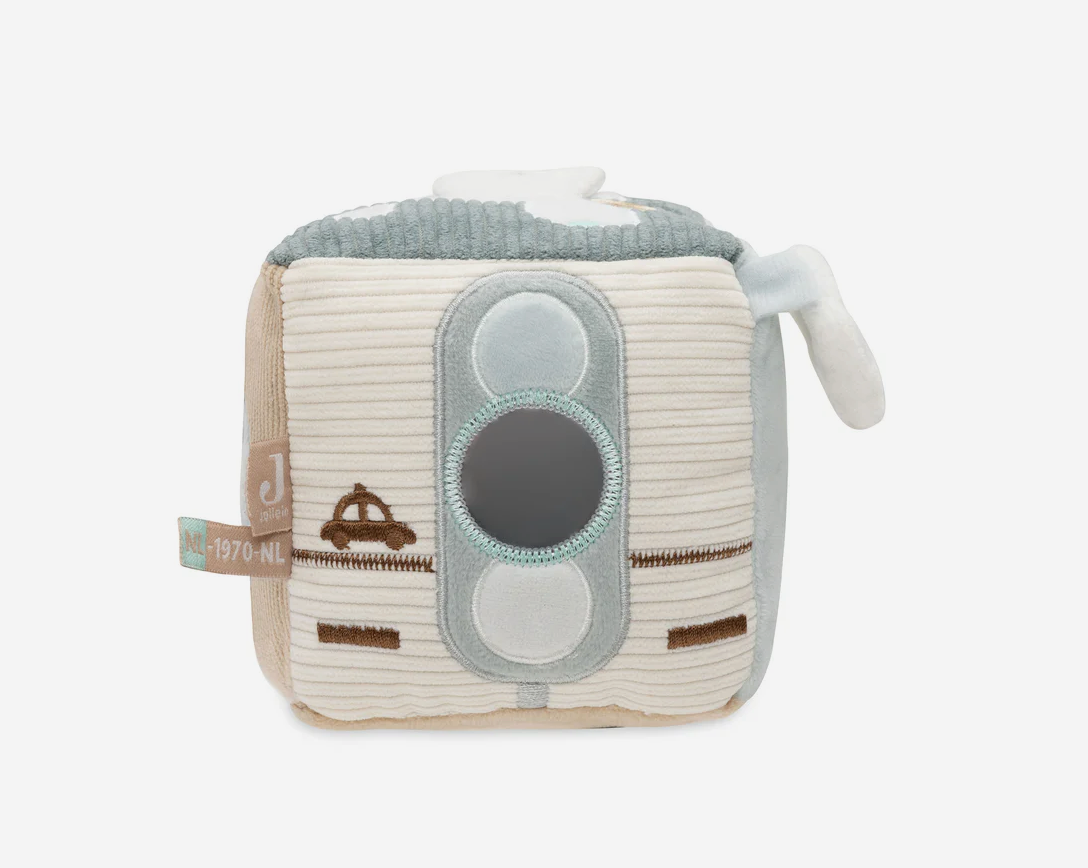 Éveiller les sens de bébé tels que la vue, le toucher et l’ouïe grâce à son miroir, ses étiquettes ou encore son crépitant. Tout en velours, le cube d’éveil est très doux au toucher. Son anneau permet de le suspendre facilement à une arche par exemple.