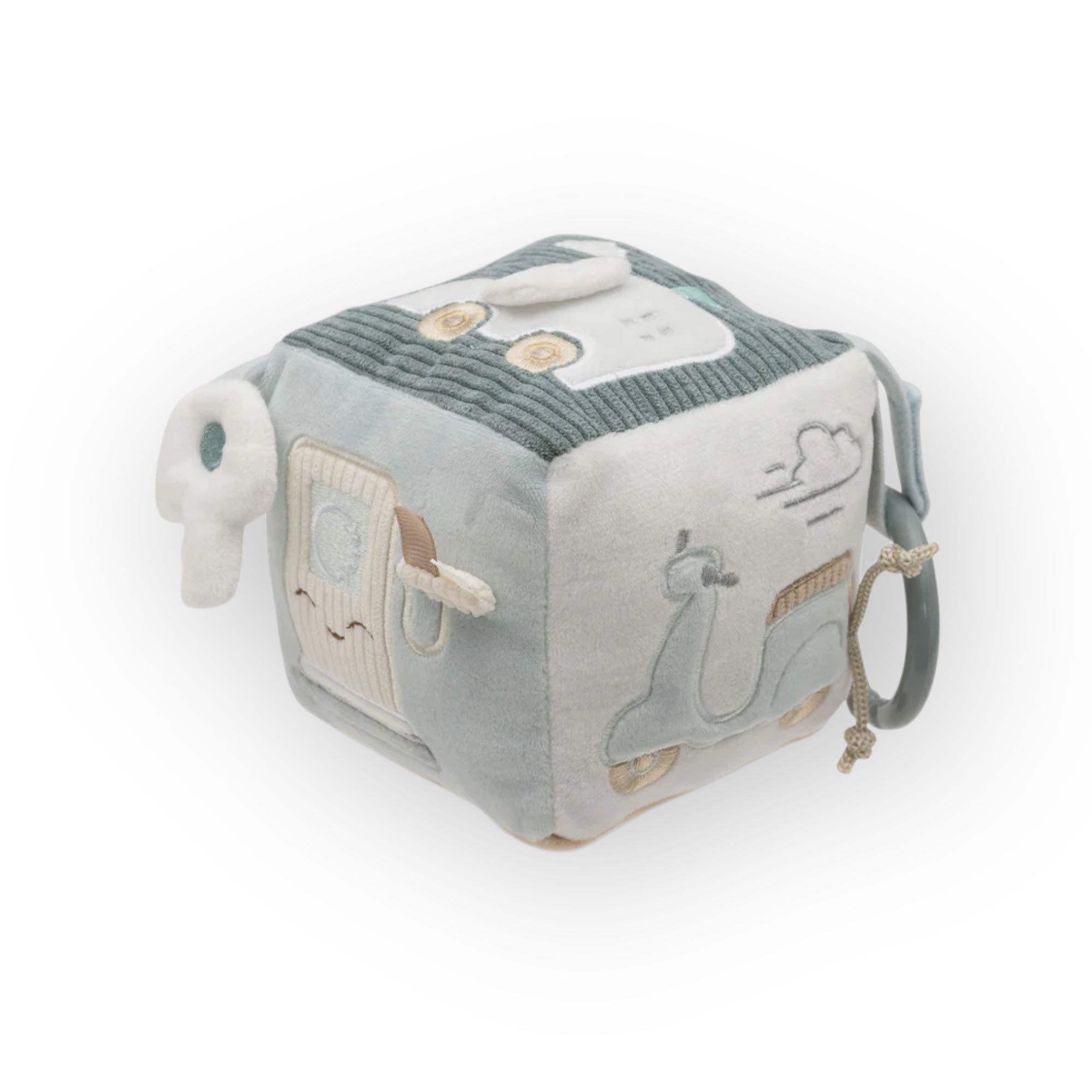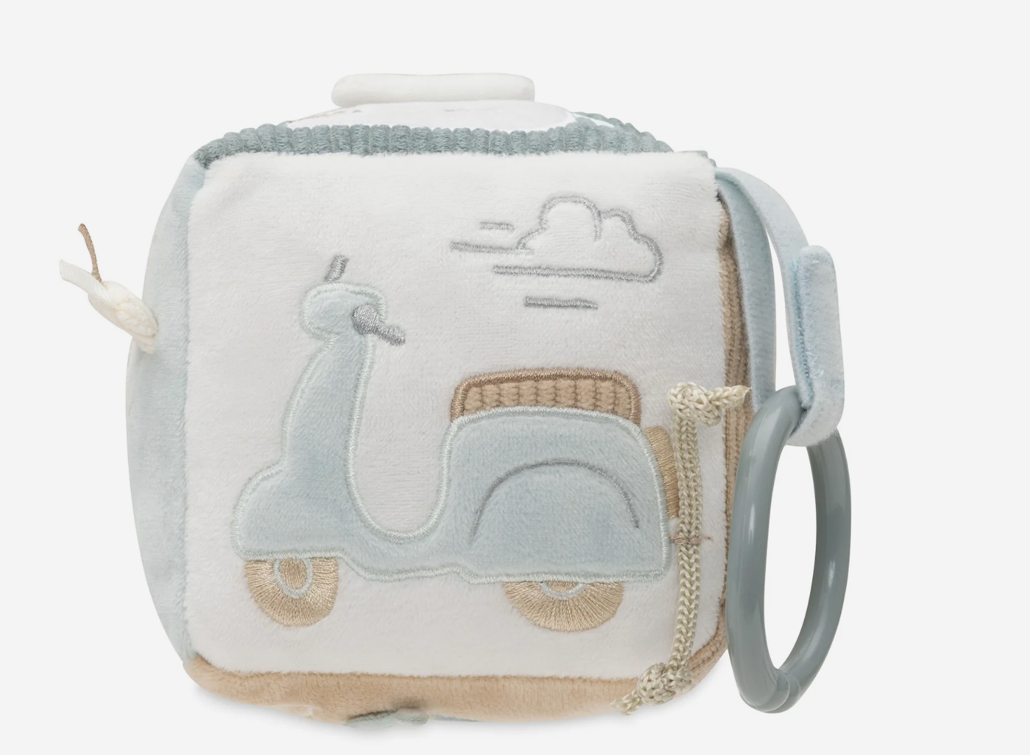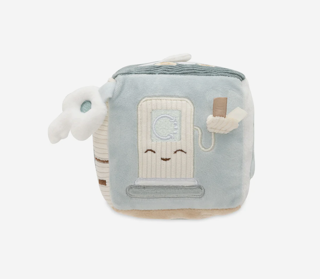 Éveiller les sens de bébé tels que la vue, le toucher et l’ouïe grâce à son miroir, ses étiquettes ou encore son crépitant. Tout en velours, le cube d’éveil est très doux au toucher. Son anneau permet de le suspendre facilement à une arche par exemple.