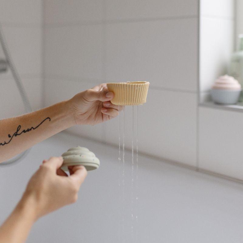 Transformez le bain en moment de jeu gourmand avec le lot de 4 jouets de bain Cupcake Mix and Max de Mushie !
